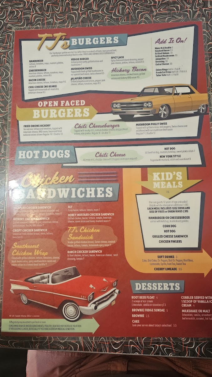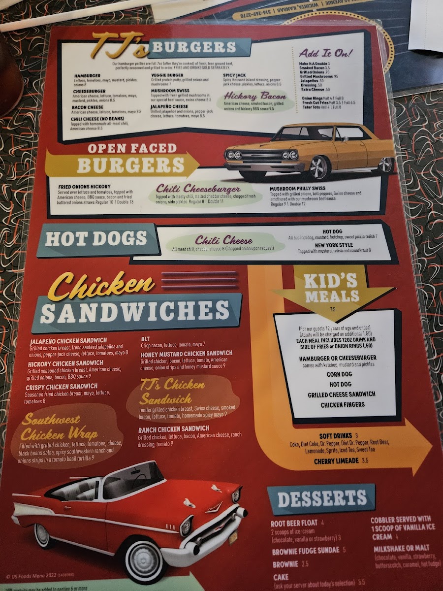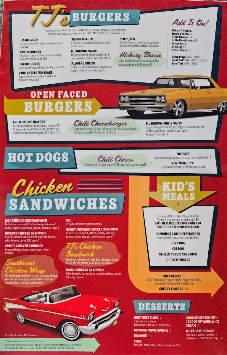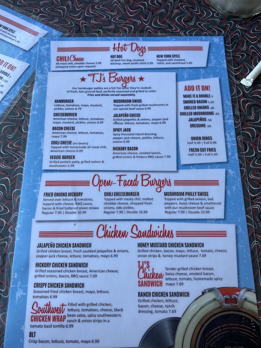 Whether you’re stopping by for a casual lunch, an easy dinner, or a relaxed weekend treat, the menu covers those timeless cravings. From a Bacon Cheeseburger or a Mushroom Swiss to crispy Tater Tots and creamy milkshakes, each dish fits naturally into the friendly, nostalgic atmosphere that TJ’s is known for.